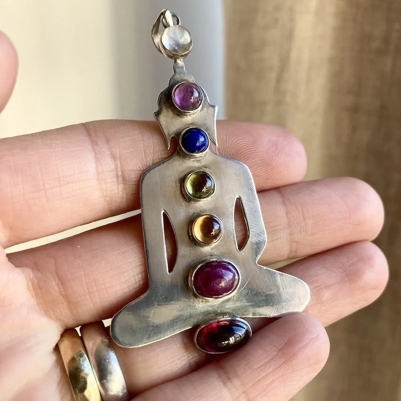 Beautiful sterling silver Buddha pendant with natural rainbow chakra crystals